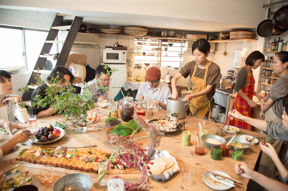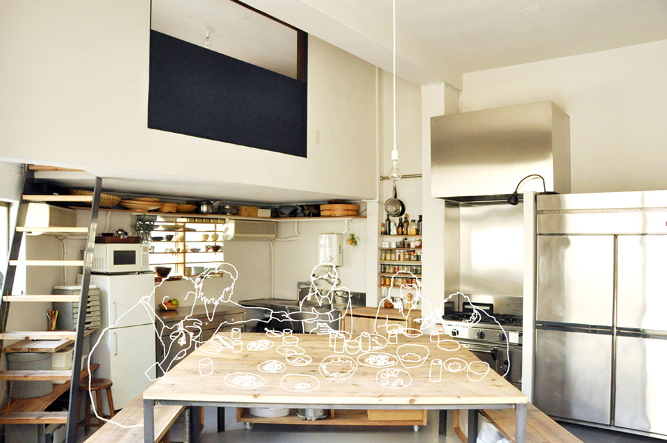 ケータリングの仕込みや撮影をするキッチンスタジオをただ閉鎖的につくるのではなく、料理を教えたり、近所の人や友人とごはんを食べたり、雑貨を展示したりと、時には周りの人々を巻き込むような実験的な場所にすることを提案した。